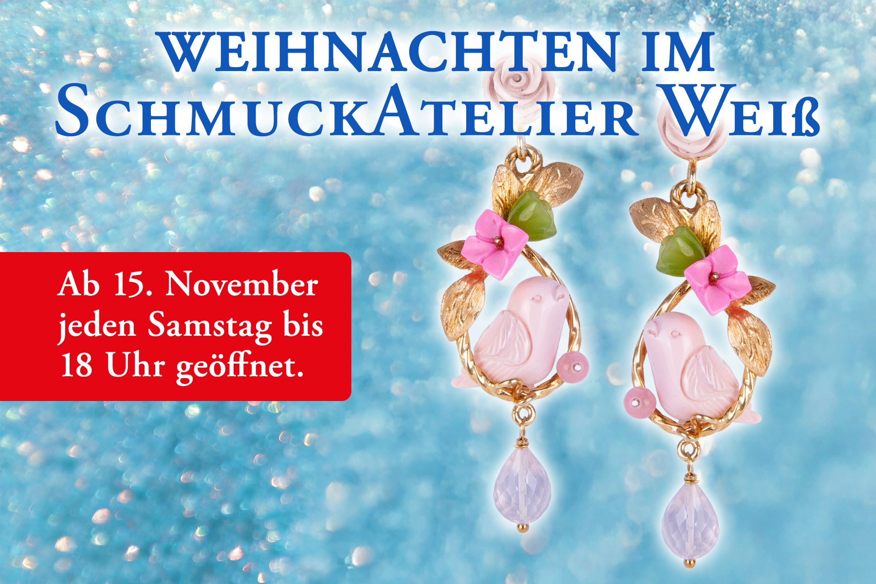 Es weihnachtet wieder im Schmuckatelier. Ab sofort finden Sie bei uns neben schönem Schmuck auch viele große und kleine Geschenkideen für Weihnachten. Und wie jedes Jahr haben wir vor Weihnachten unsere Öffnungszeiten für Sie angepasst. Ab dem 15. November sind wir an allen Samstagen bis einschließlich dem 20. Dezember von 10 - 18 Uhr für Sie da. Wir freuen uns auf Ihren Besuch.